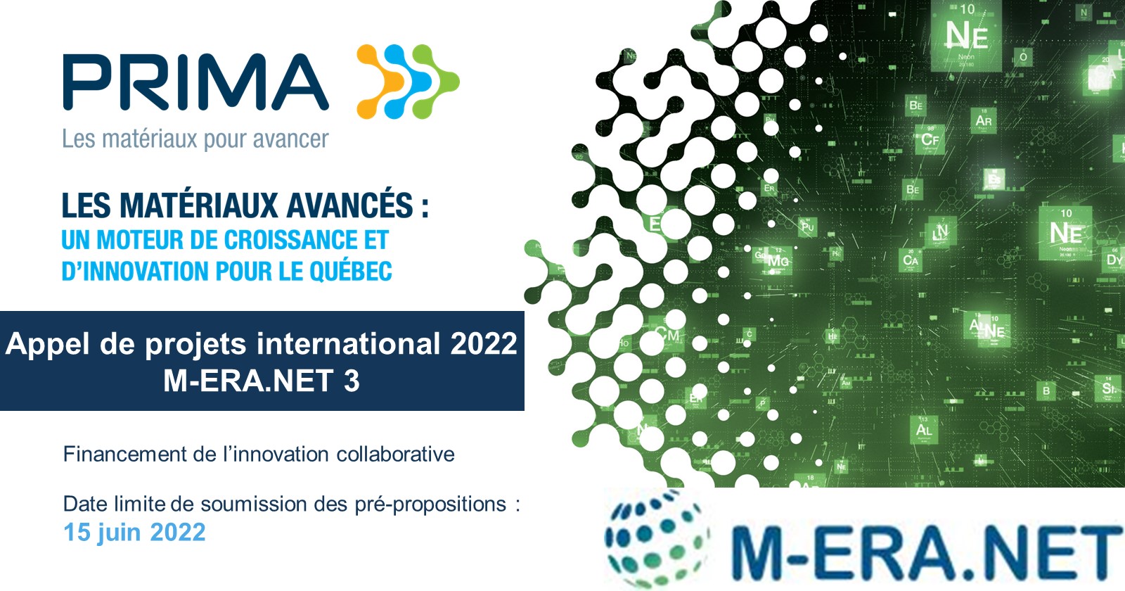 Pour appuyer la recherche et développement (R-D) collaboratif dans les matériaux avancés, PRIMA Québec lance un nouvel appel de projets international dans le cadre du PSO-International. Le PSO-International contribue à soutenir l’action internationale des acteurs québécois des milieux universitaire, collégial, institutionnel et industriel travaillant dans les différents créneaux de la recherche et de l’innovation. À cet effet, le ministère de l’Économie, de l’Innovation et de l’Énergie (MEIE) soutient PRIMA Québec dans sa participation à l’appel M-ERA-NET 2024. Dans le cadre de cet appel, 35 agences de financement de 29 pays participent avec un budget total d’environ 35 millions €.